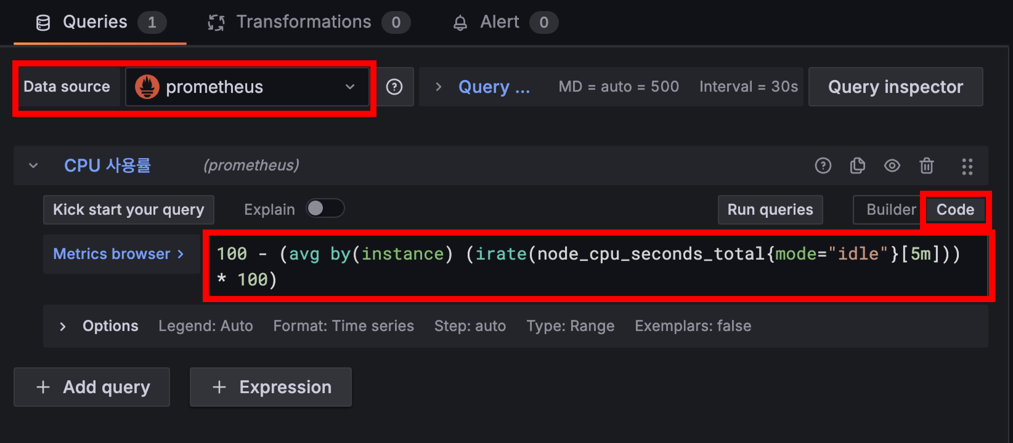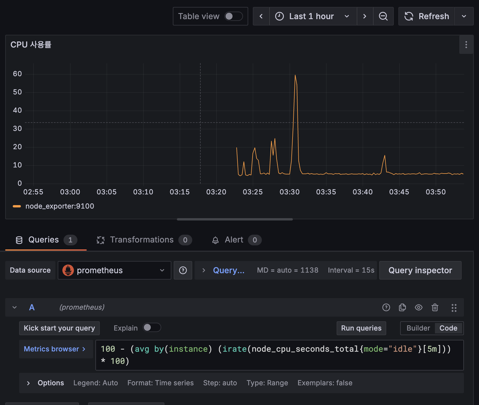 - 일단 이 쿼리를 받고 답변을 돌려주는 것은 프로메테우스! 프로메테우스는 node_exporter가 수집해오는 데이터를 보고 정리해서 나한테 보여주는 것이다