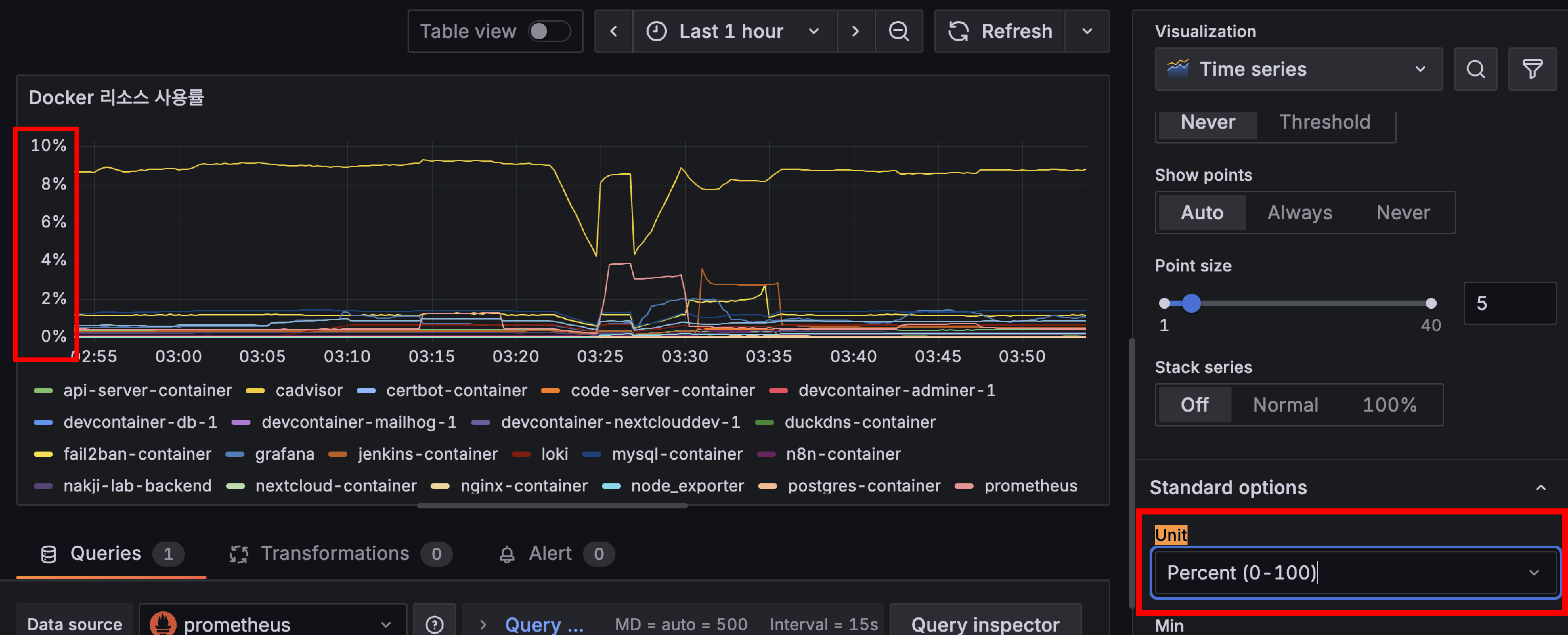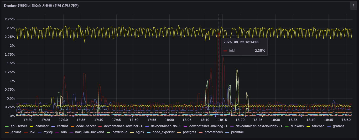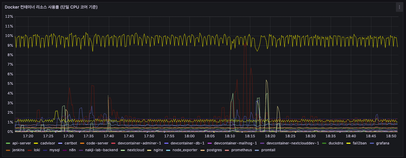 - 이거는 각 컨테이너가 CPU 코어별로 얼마나 리소스를 잡아먹는지 확인해서 아래 두가지를 확인하고자 했음