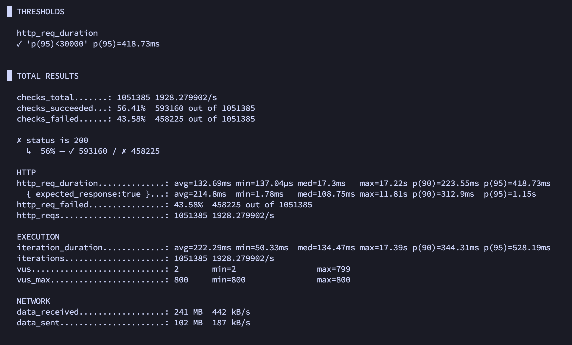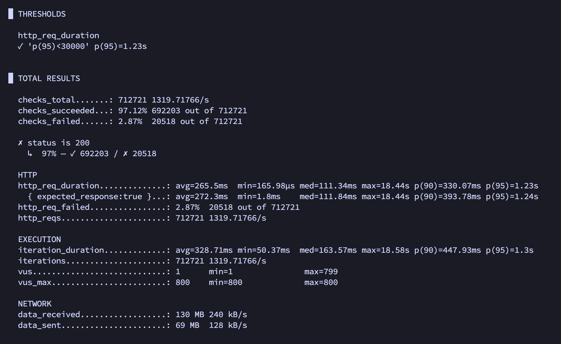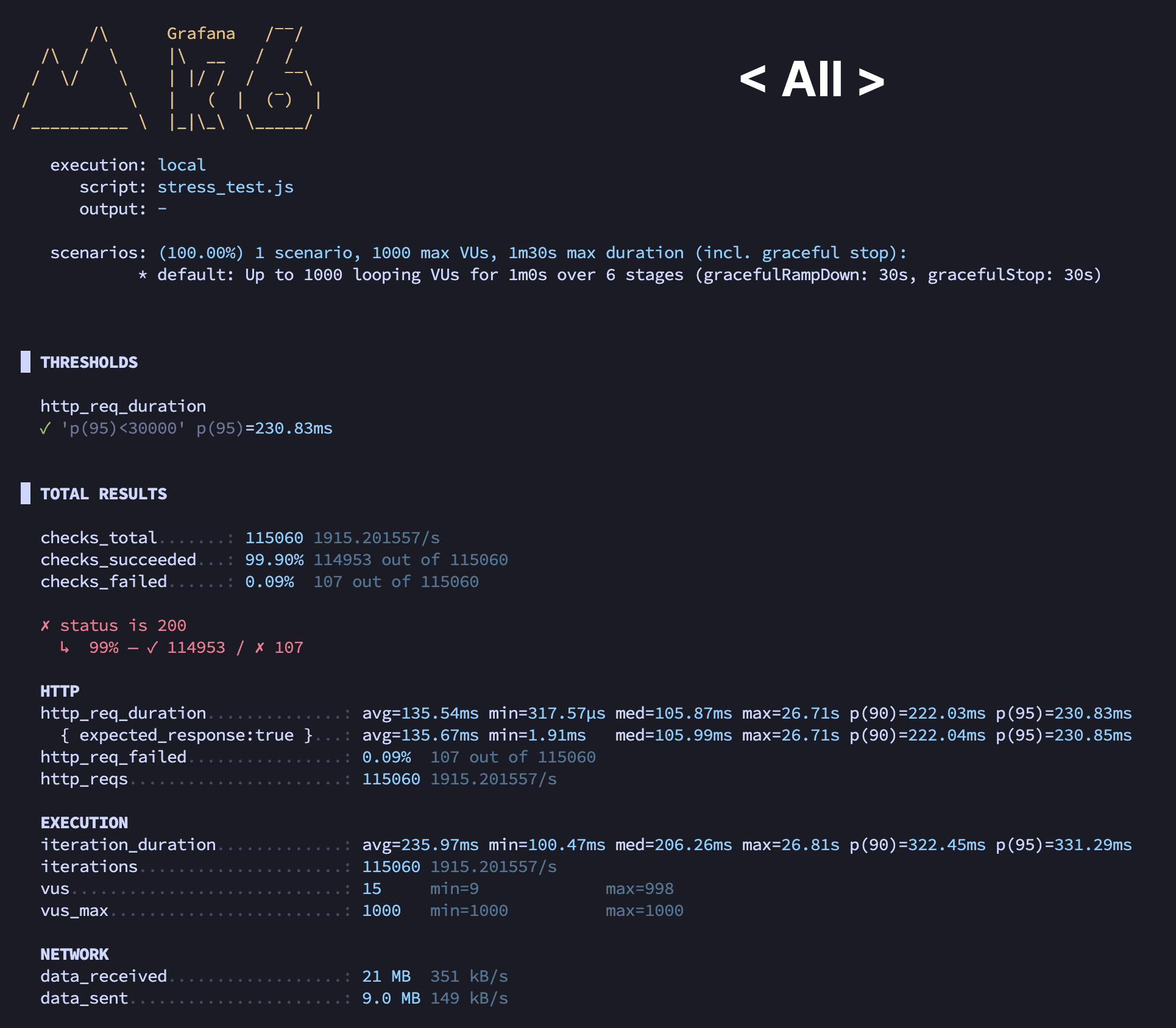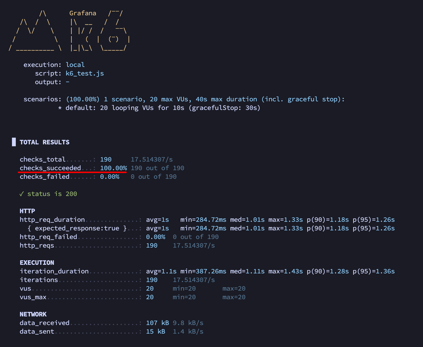 - 결과에서 볼 수 있는 것들이 다양했다 전체 요청 시간(e.g. p95)부터 테스트 성공 비율, 총 요청횟수 등등