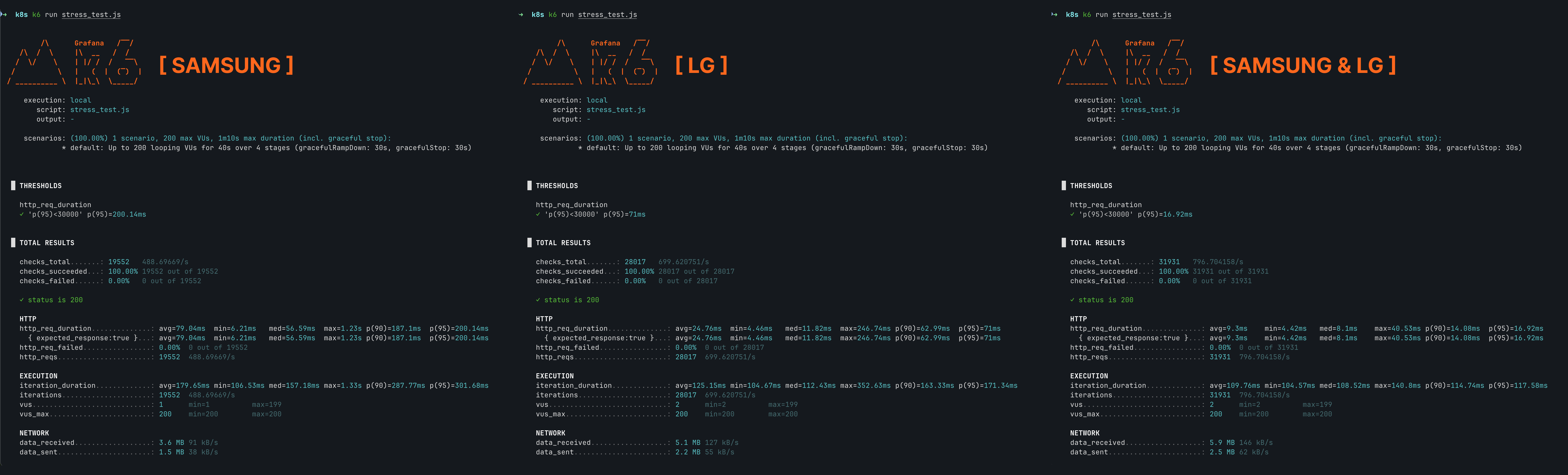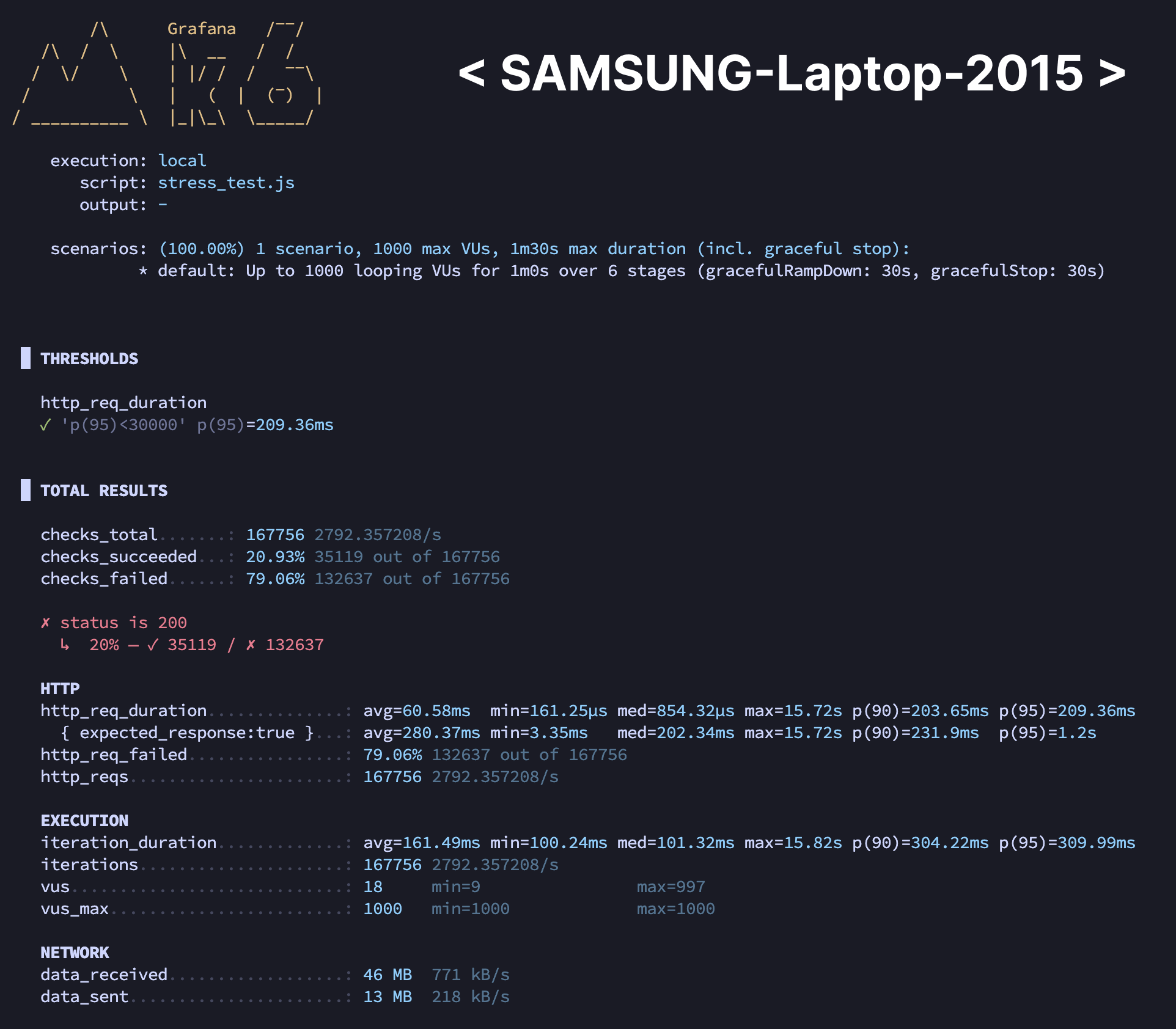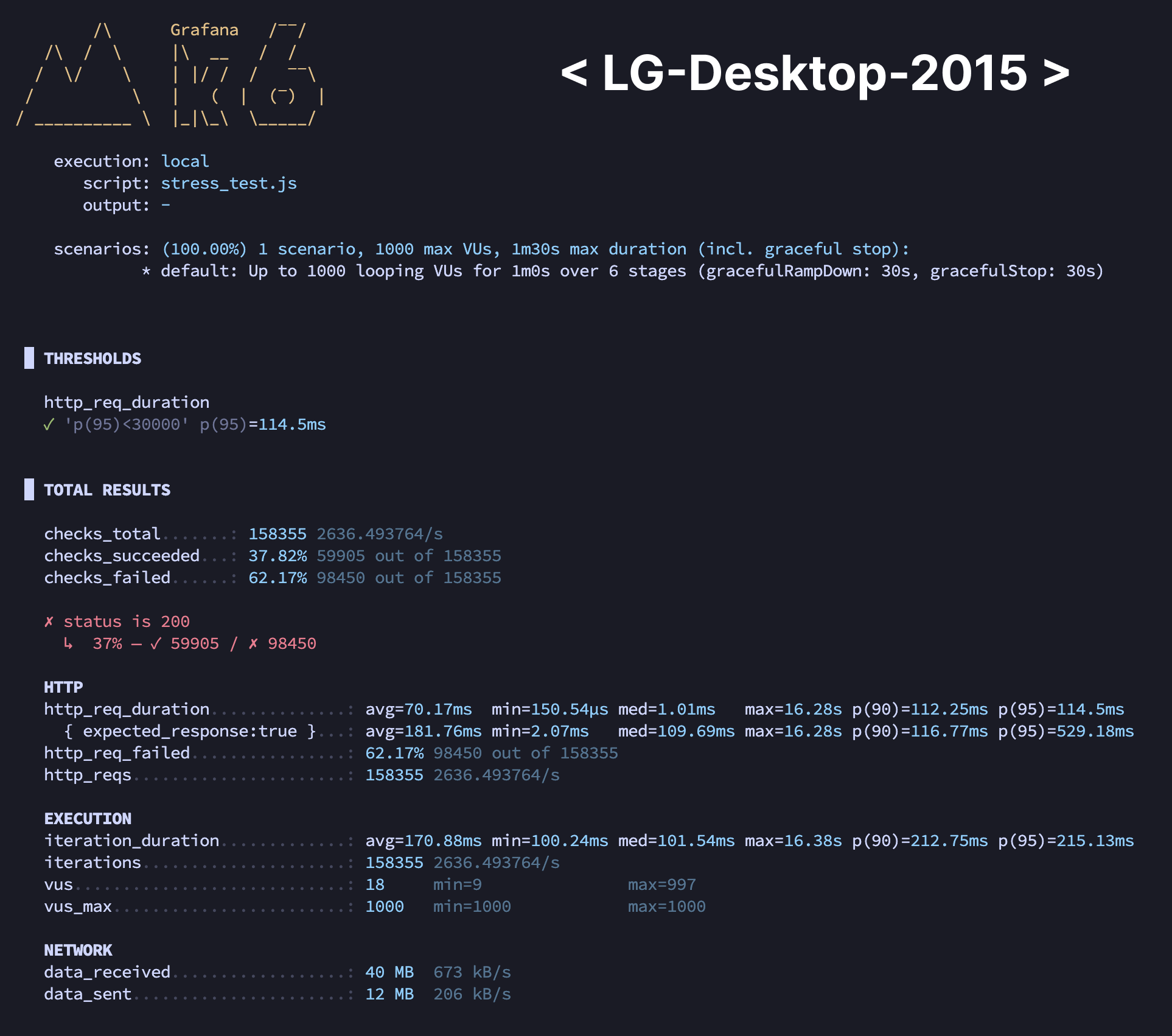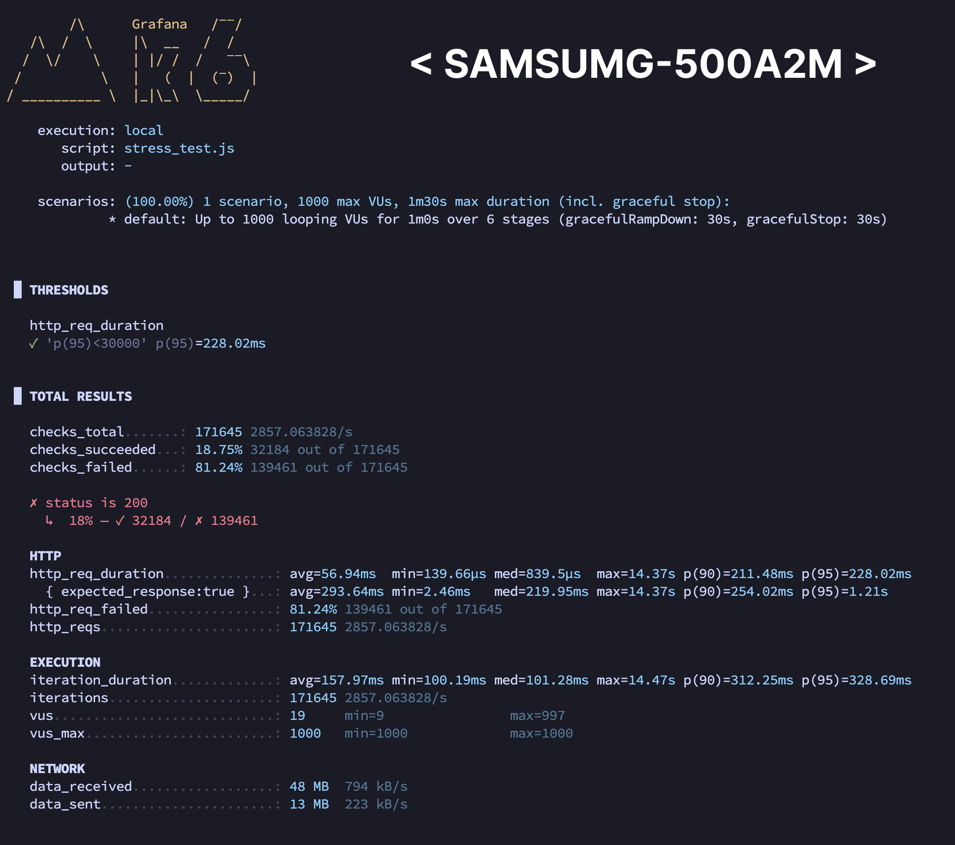 - 결과에서 볼 수 있는 것들이 다양했다 전체 요청 시간(e.g. p95)부터 테스트 성공 비율, 총 요청횟수 등등