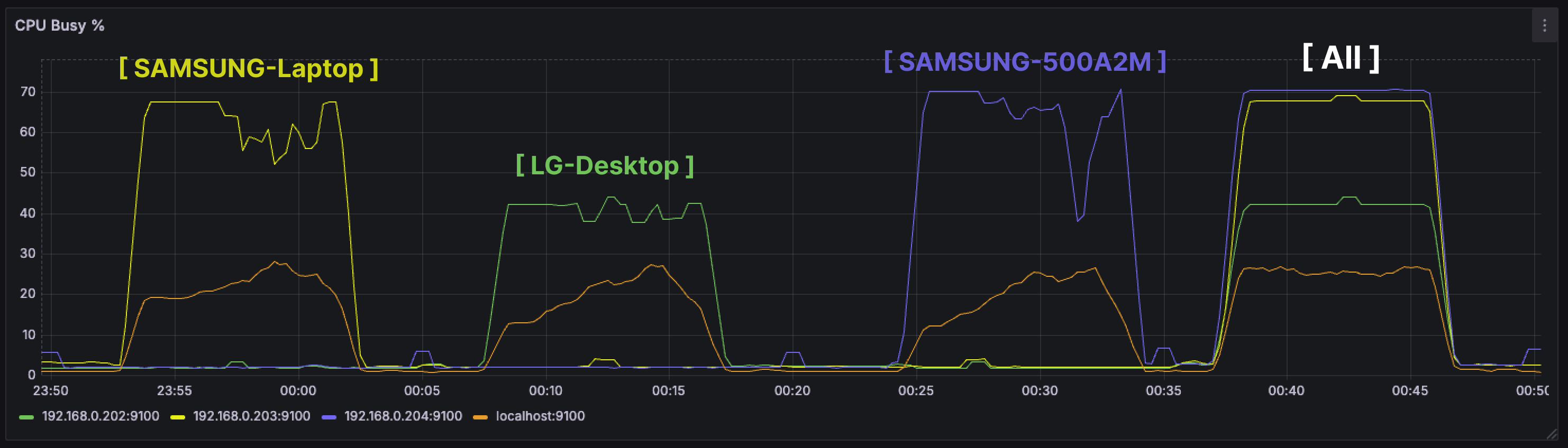 - 그리고 그러한 구조 덕분에 전체적인 CPU 사용률이 50%를 크게 넘기지 않고 안정적으로 유지됨을 확인할 수 있다