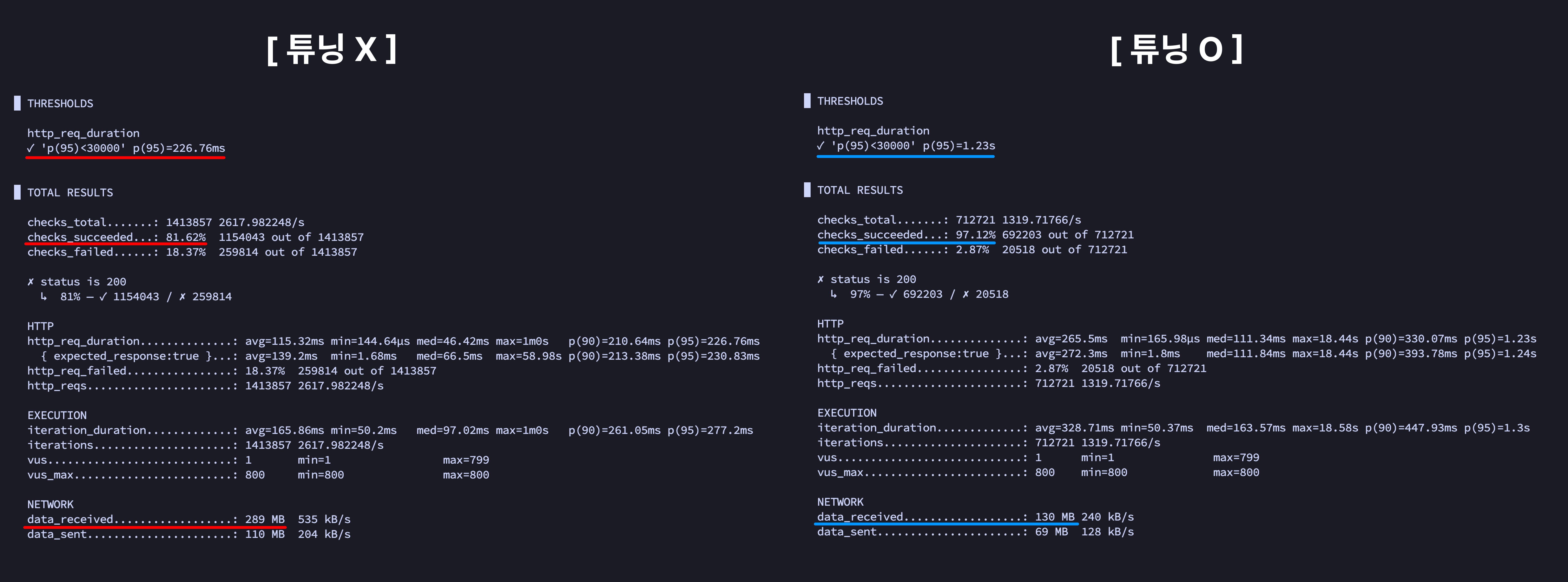 - 그것보단 100% 수치에 가까워진 성공률과 재시도가 줄어들어 data_received가 줄어든 것이 유의미했다 (네트워크 효율 상승)