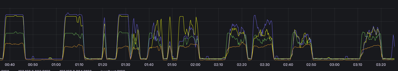 - 이후에 점차 느려질 때 나머지 두 서버가 백업하는 식으로 동작되고 있음을 확인할 수 있다 (초록색 CPU 사용률이 감소하기 시작할 때부터 파란색과 노란색이 점차 상승하며 전체적으로 안정적인 상태를 유지한다)
