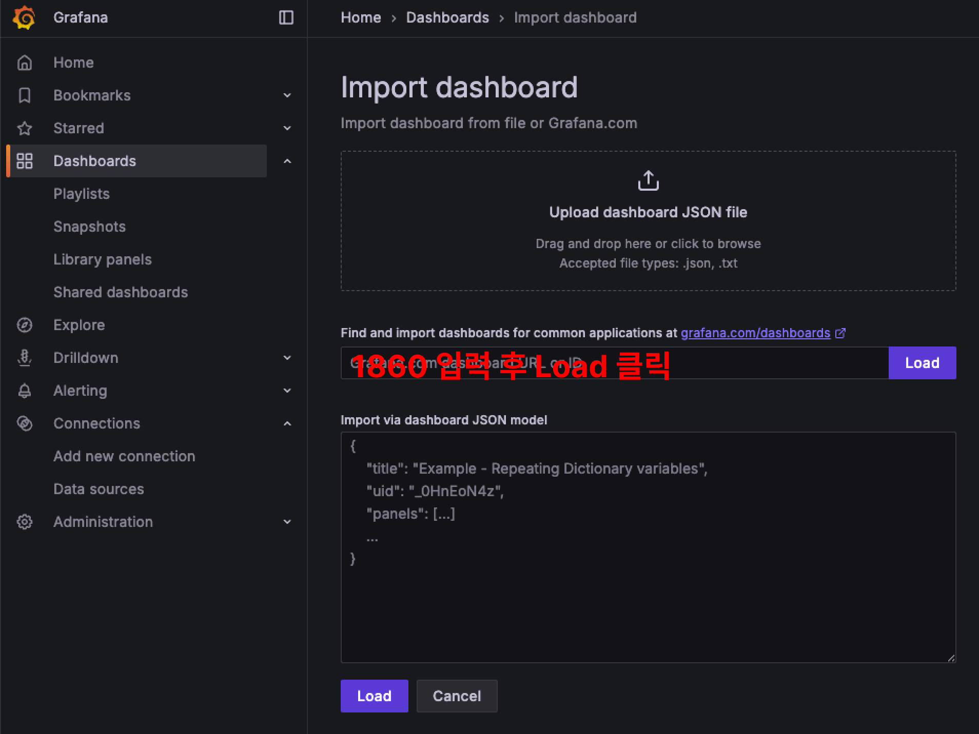 적용하는 방법은 대시보드 import 누르고 Load 클릭하면 위 템플릿이 적용된다