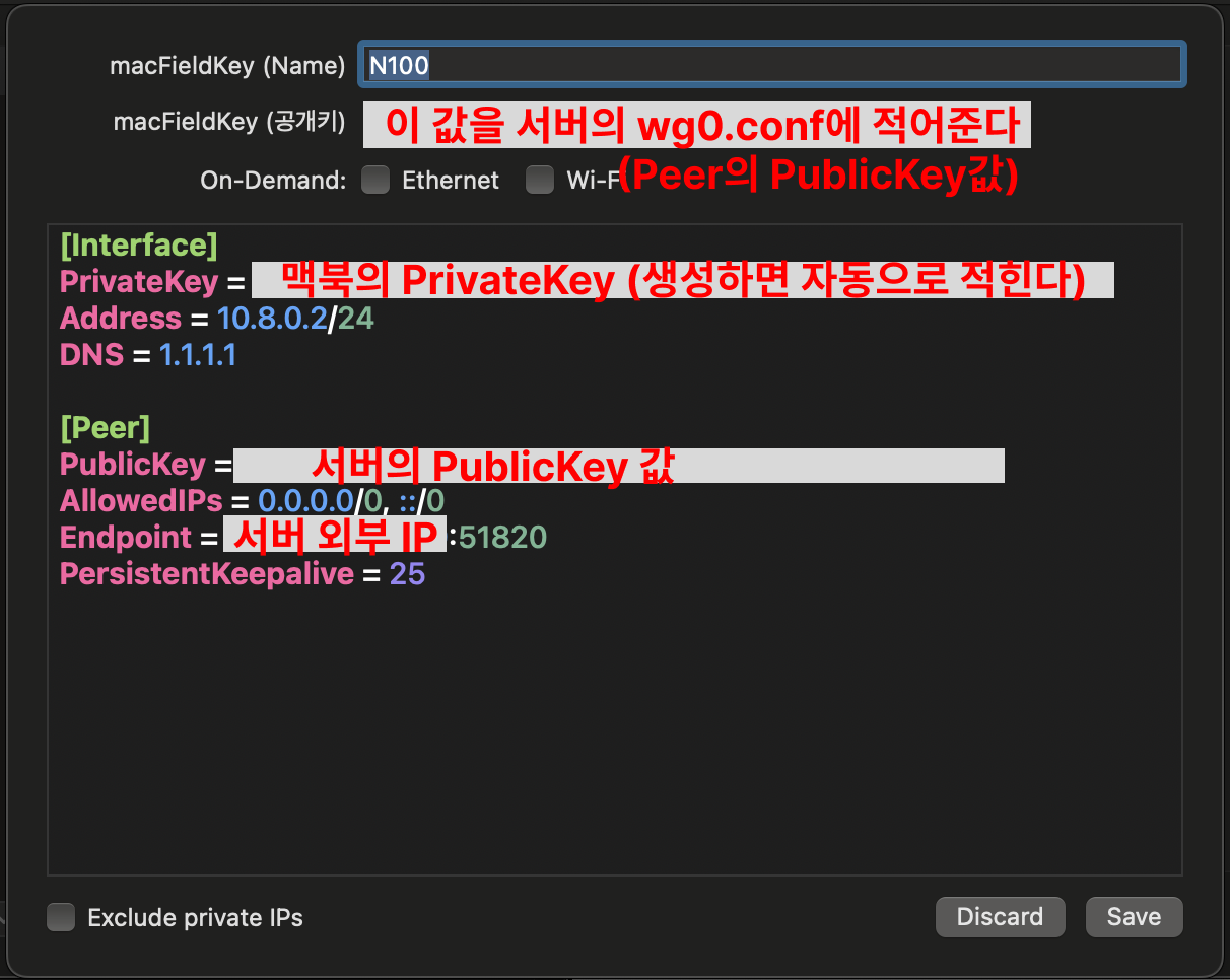 - 여기서 얻은 PublicKey 값들을 서버에 적어두면 VPN 서버에 접속할 수 있게 된다