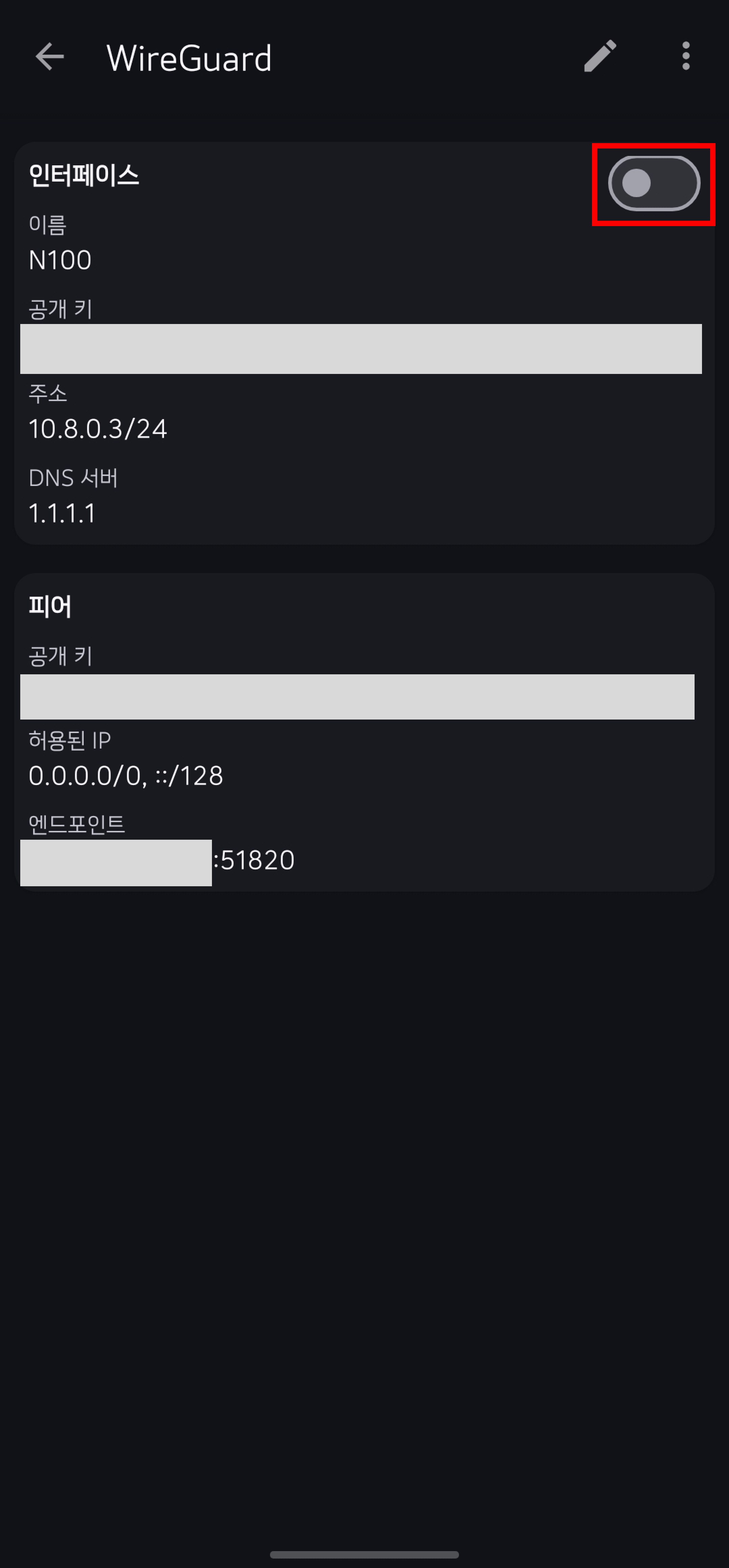 - 저장하고 나면 WireGuard 어플에서 토글로 켜고 끌 수 있다