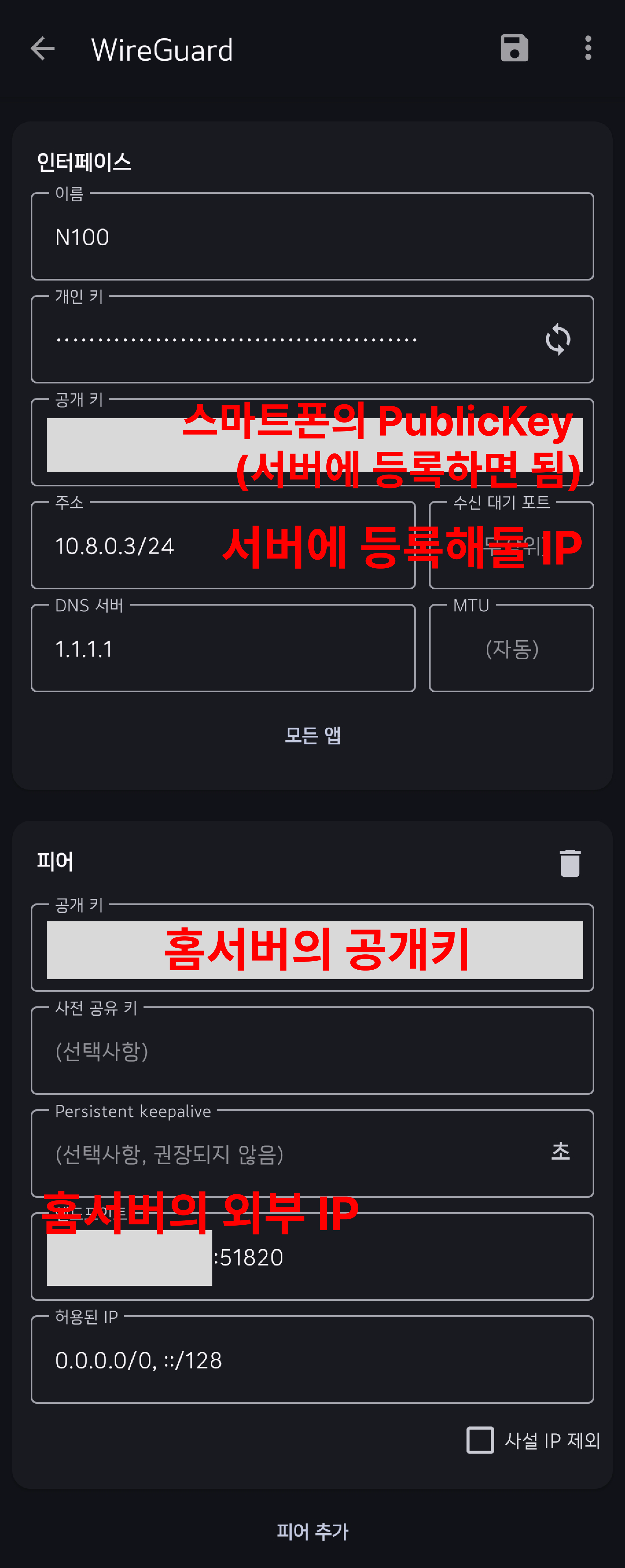 - Address는 홈서버의 wg0.conf에 적어줄 IP를 그대로 적으면 된다