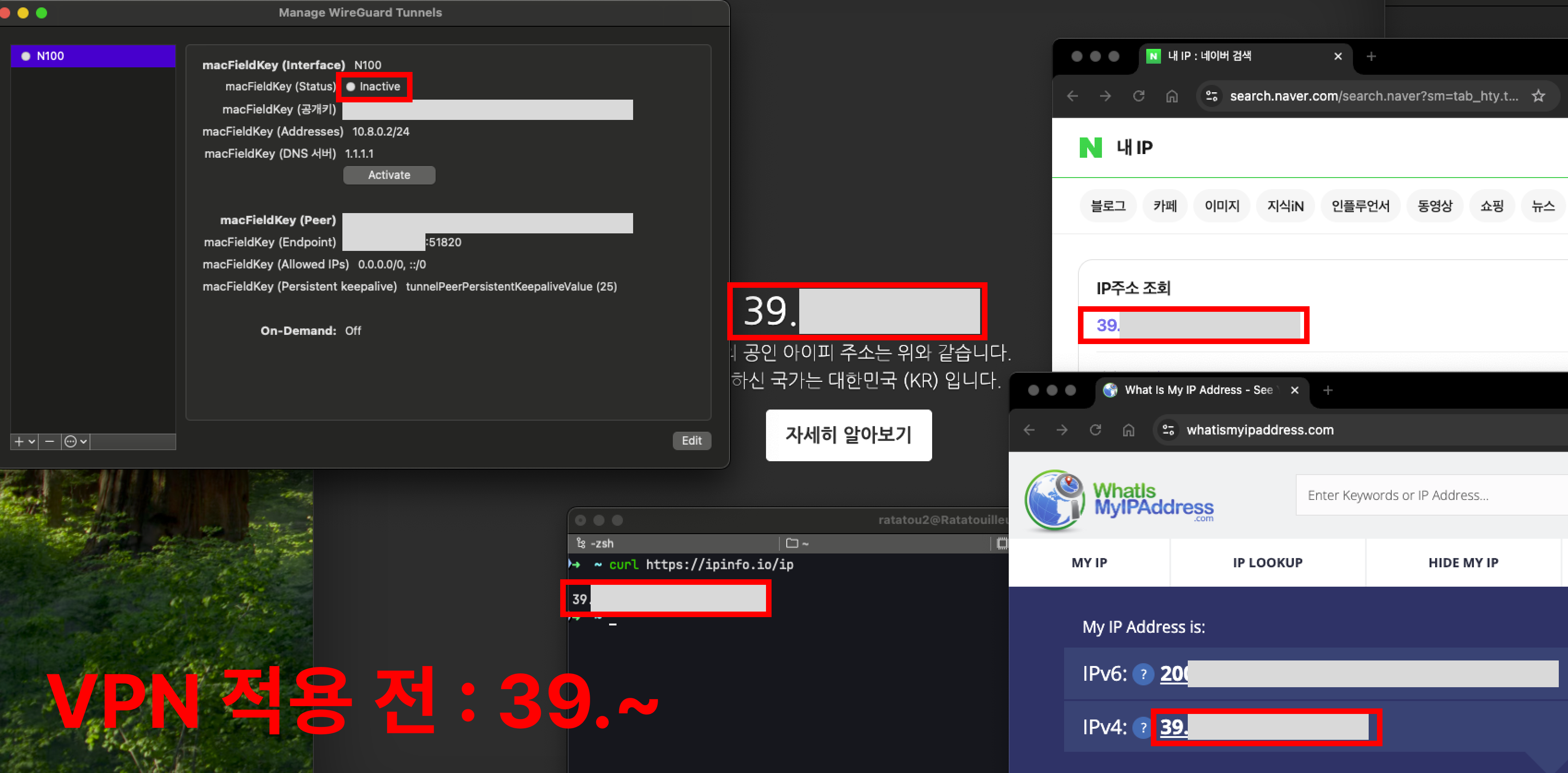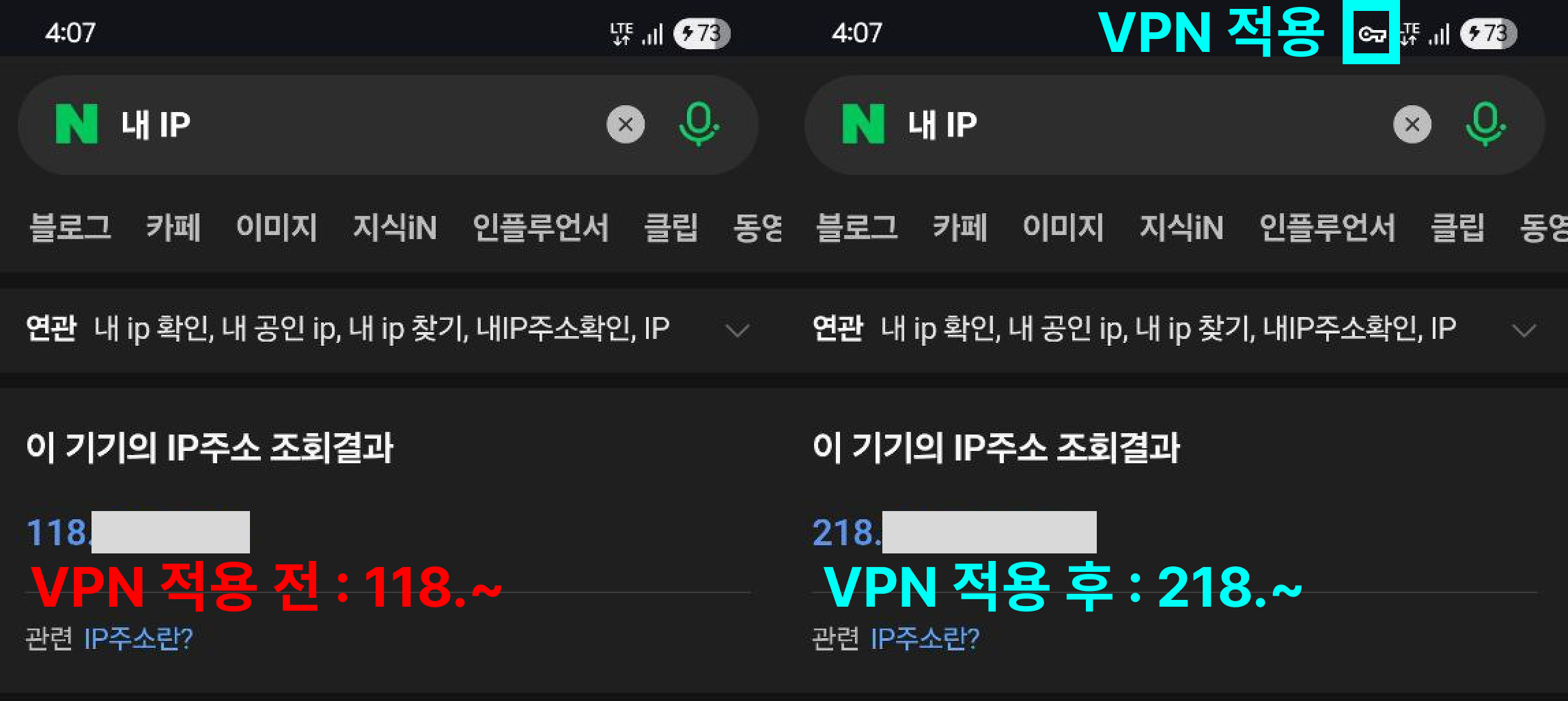 - VPN 적용하면 IPv6가 안나오는 것을 볼 수 있는데 나는 IPv6 옵션은 켜두지 않았기 때문이다