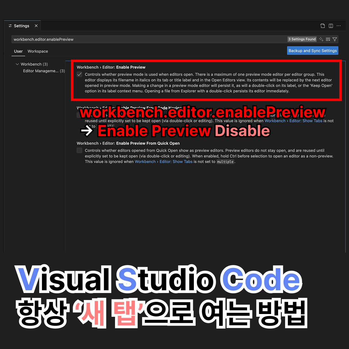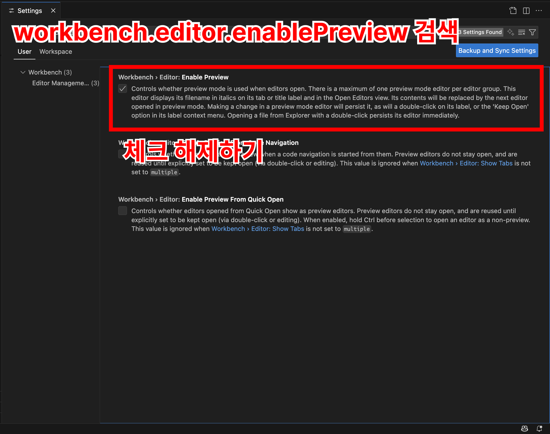 VSCode로 새 파일을 열면 항상 다른 탭에 덧씌워지거나 사라지는 경우가 답답했고 끄는 방법을 찾았음