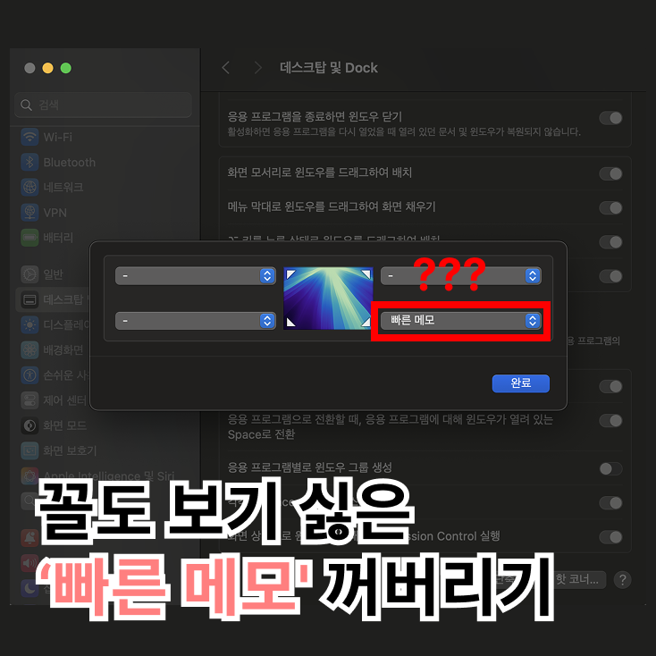 설정 - 데스크탑 및 Dock - 핫 코너 - [빠른 메모]를 [-]로 변경