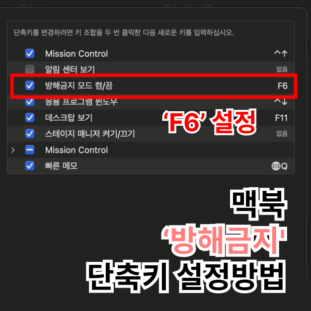 설정 - 키보드 - 키보드 단축키 - Mission Control - 방해금지 모드 켬/끔 - F6 설정