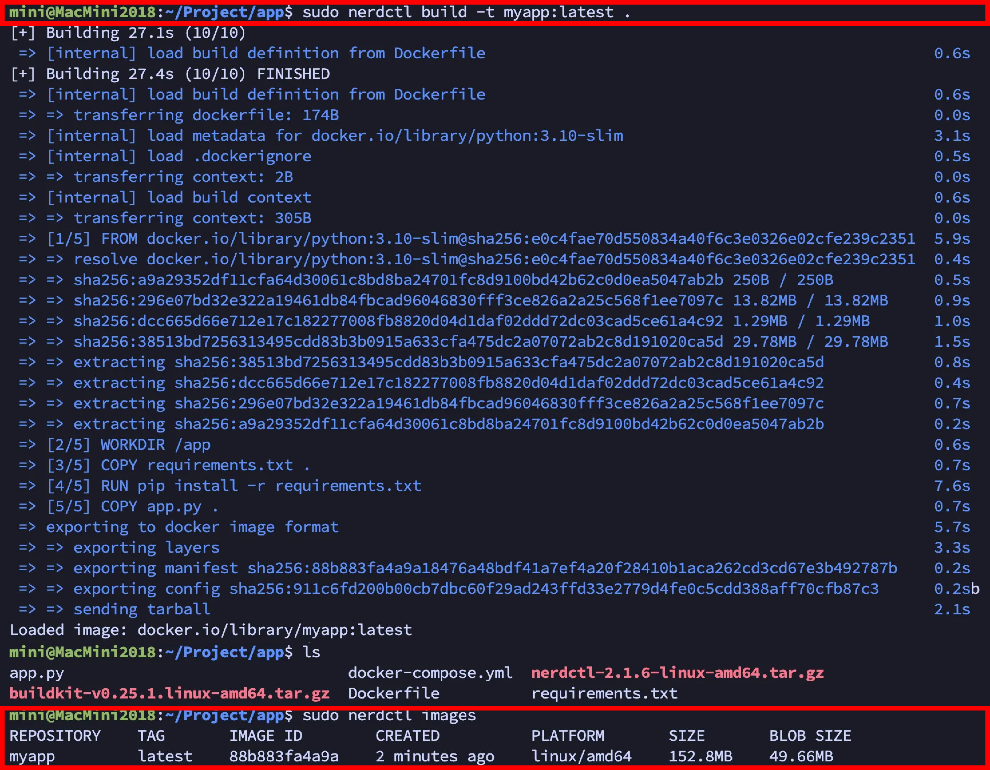 - 재밌는게 일반 빌드와 달리 nerdctl로 빌드하면 디렉토리에 빌드 파일로 남지 않는다