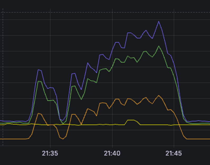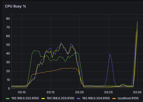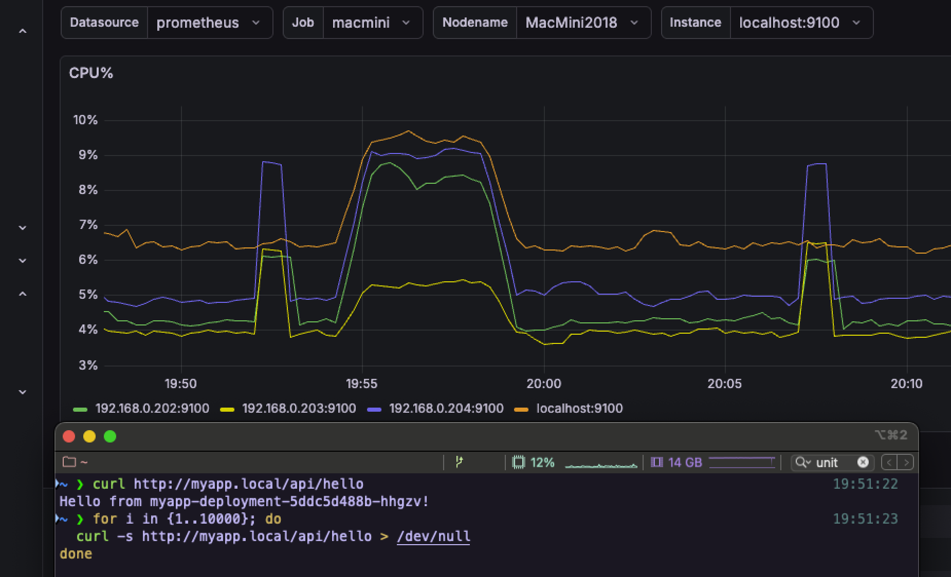 - 그리고 요청 테스트를 시도하니까 그라파나의 CPU 그래프가 튀면서 정상적으로 각자 요청을 받고 있음을 확인할 수 있었다