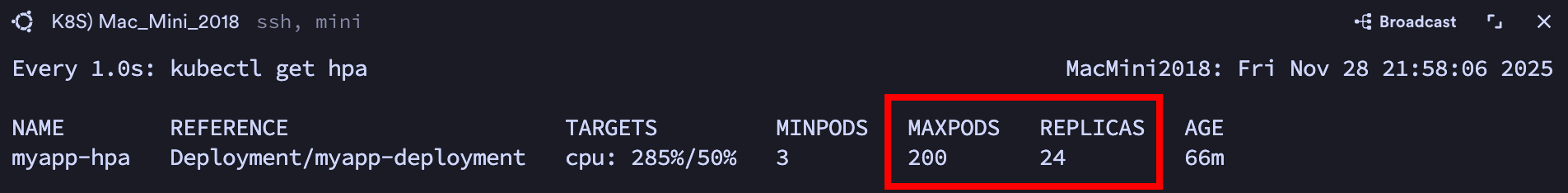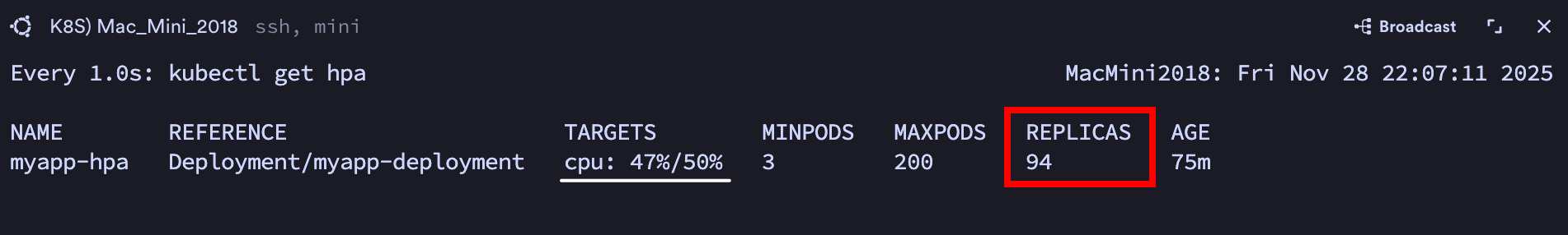 - 이후 곧 내가 세팅한 CPU 사용률이 50%에 머무를 때까지 레플리카 증식