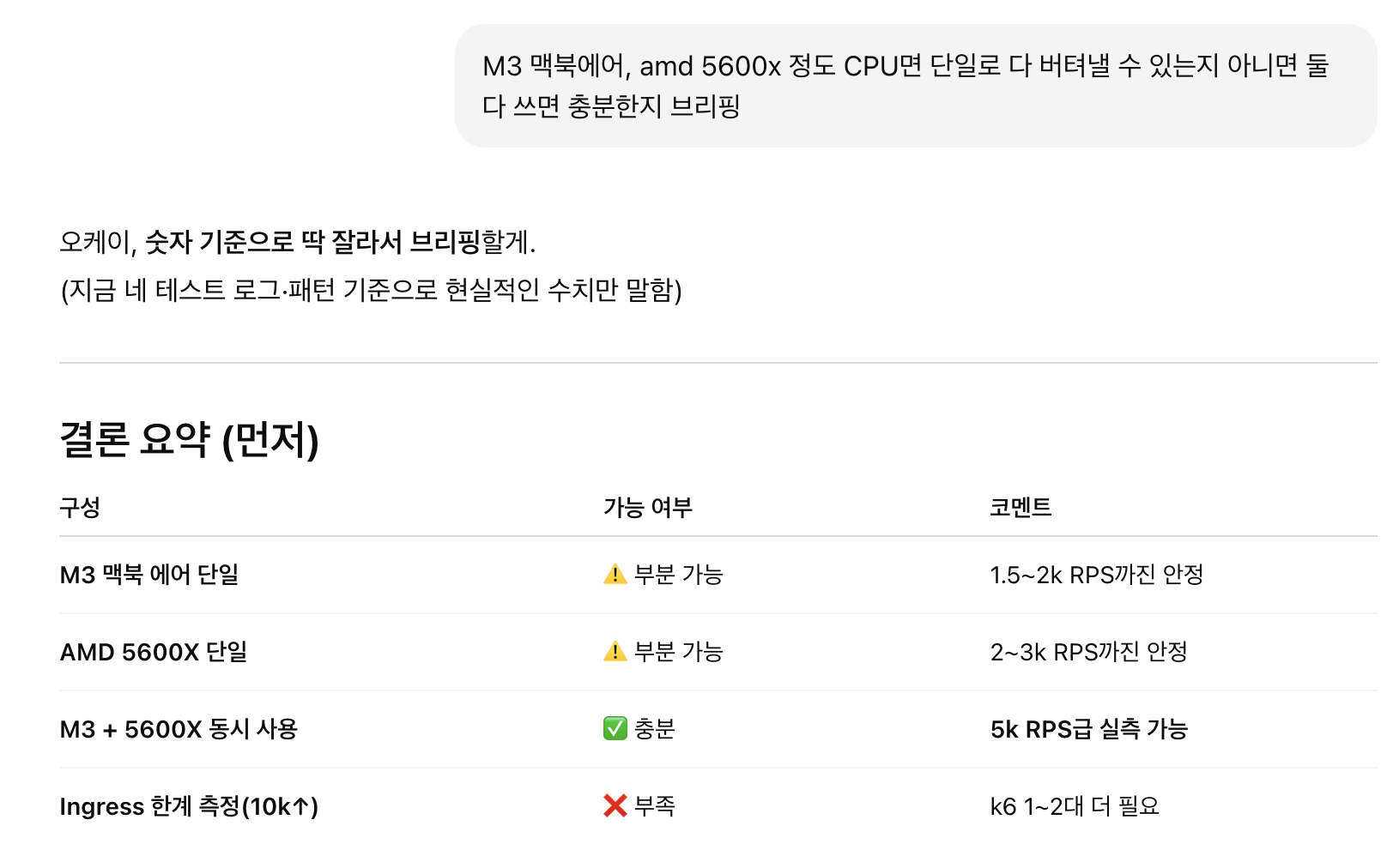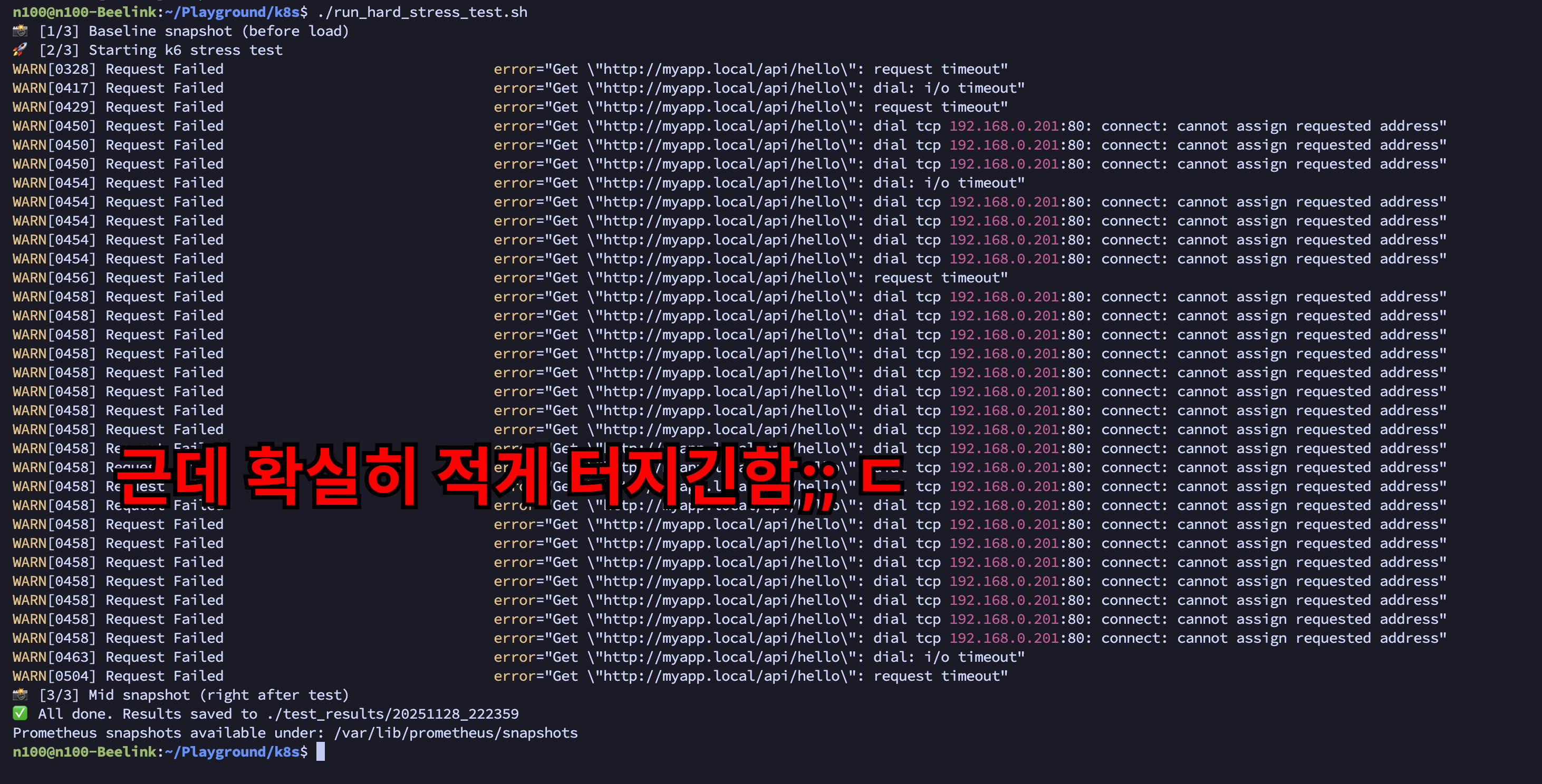 - 쉽게 말해 k6 부하테스트를 걸던 n100 홈서버가 '나약했기 때문'이다