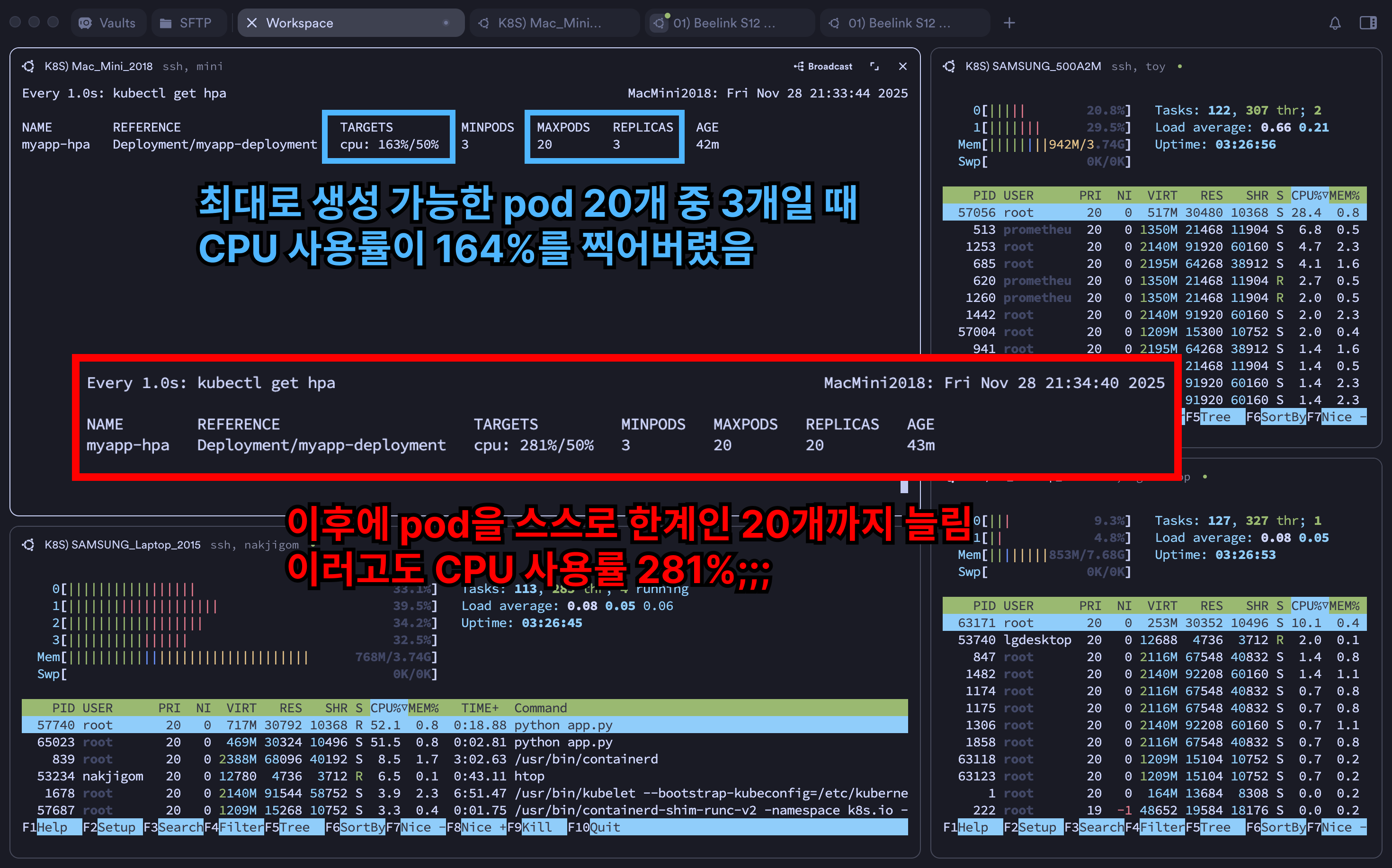 - 결국 미니 PC에서 클러스터쪽으로 테스트를 보냈는데? 스펙 한계상 포트에 부하가 와서 새롭게 연결을 추가 생성 못했고 그래서 문제가 생겼었다는 것