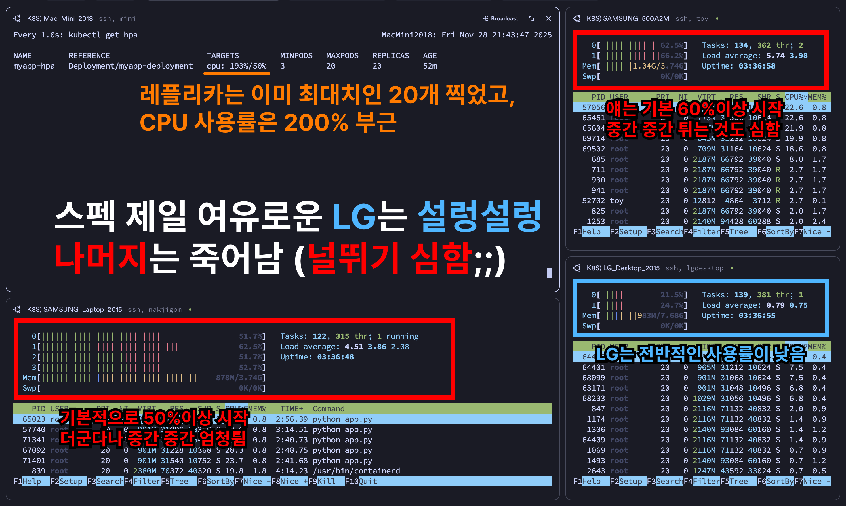 - 더군다나 app 서버 3대 중 (그나마) 제일 여유로운 스펙인 LG 데스크탑은 CPU 사용률 여유로운데 나머지는 널뛰기 시작