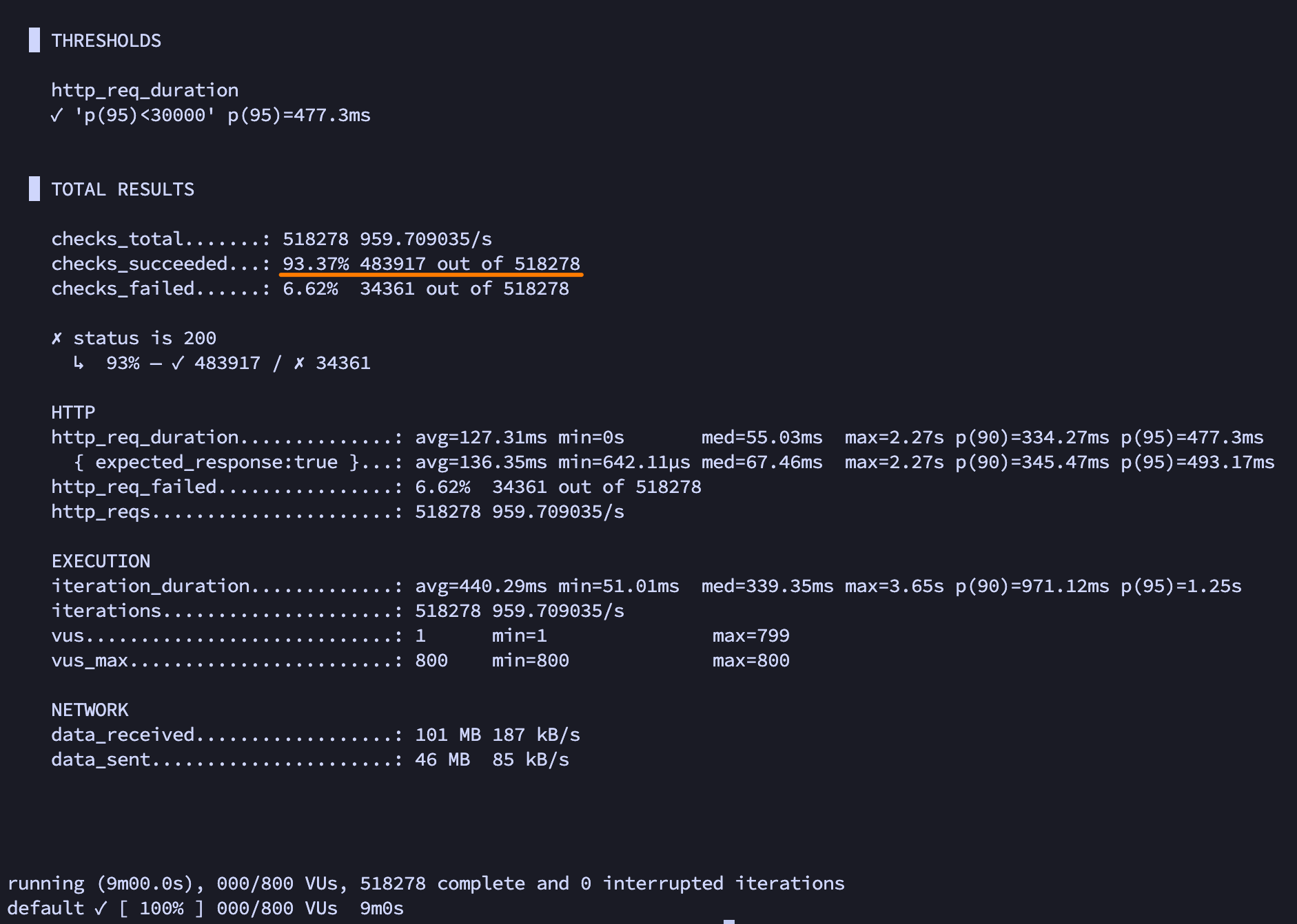 - 그건 이제 k6는 요청을 보내기 전에 실패한 것을 http_req_duration 통계에 제대로 포함하지 않기 때문이다