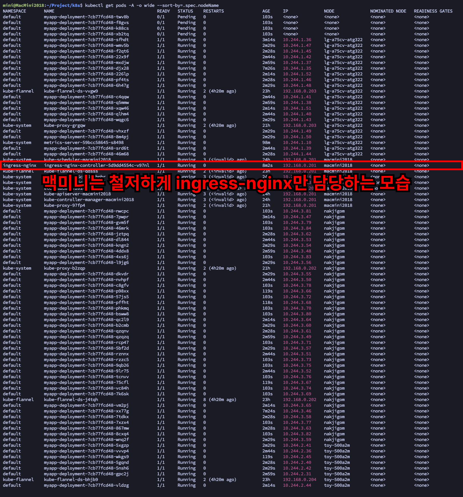 - 이번에는 맥미니에만 ingress-nginx를 띄워서 nginx 분산처리 때와 똑같은 구조를 만들고자 했다
