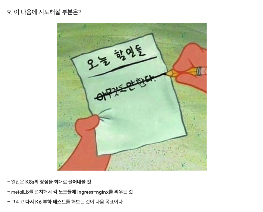 - 특히, nginx는 내가 진행한 모든 로직을 이해하고 진행한 반면, 쿠버네티스는 큰 줄기만 이해할뿐 디테일한 요소는 이해가 떨어져서 더 진행하는 것이 성장에 의미 없겠다는 판단하에 중지하였음