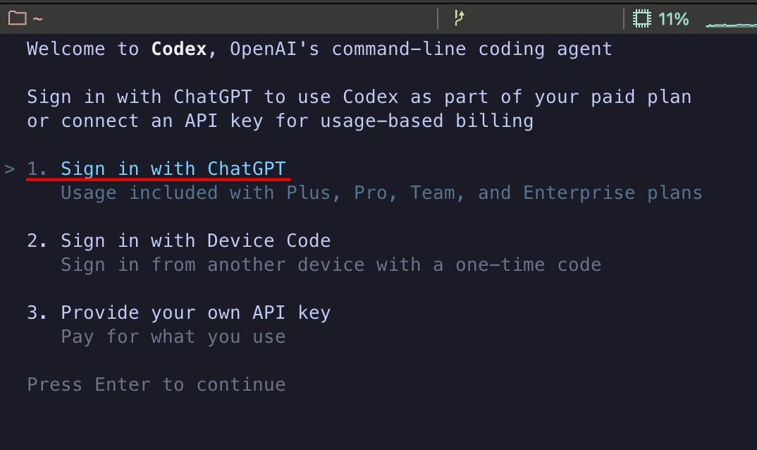 - 터미널에서 'codex'를 입력해 실행시키면 아래처럼 계정을 로그인해 연결할 수 있는 옵션이 뜬다 (1번째)