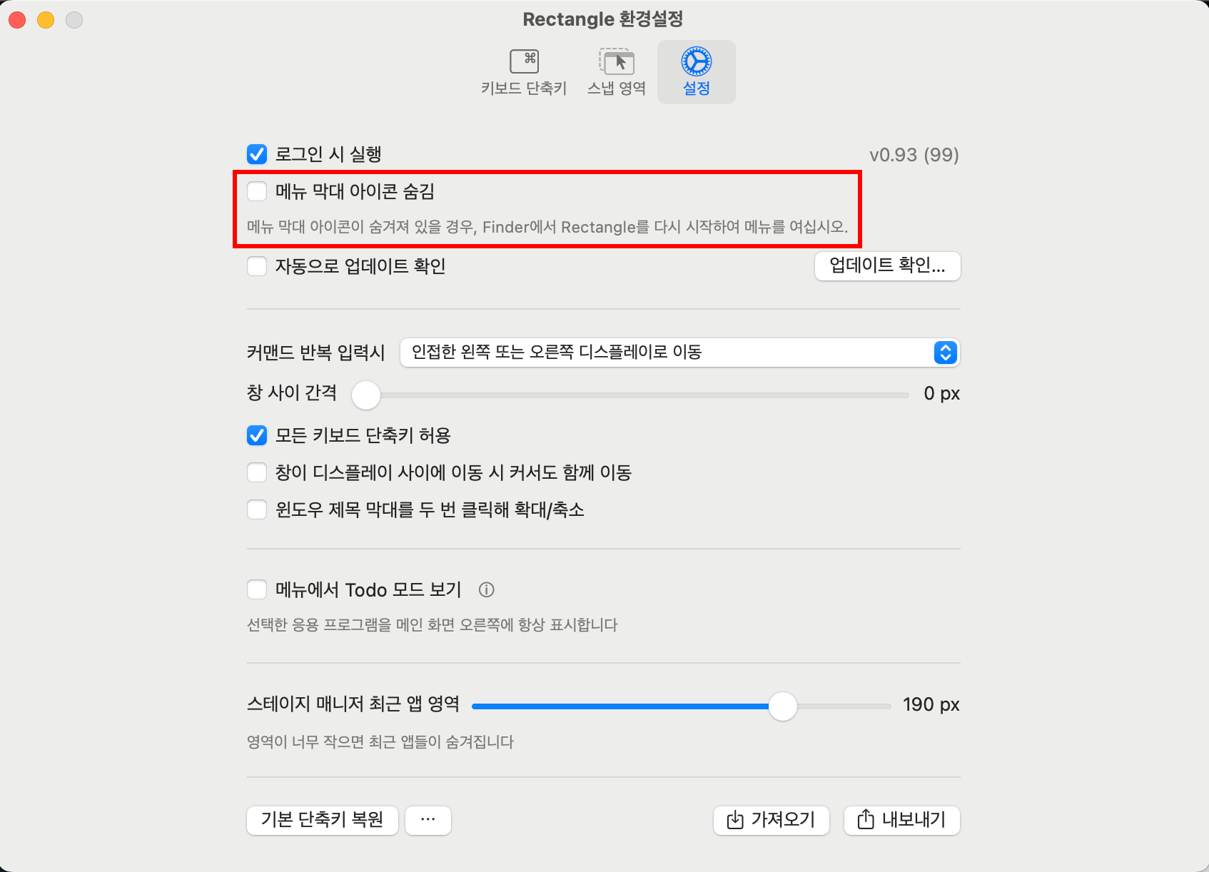 - 아 참고로 설정에서 상단 아이콘을 끌 수도 있다