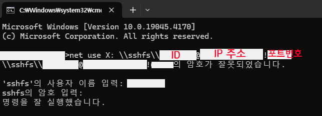 net use [쓰고싶은 드라이버 영문자]: \\sshfs\\[유저 ID]@[IP 주소]![포트번호]